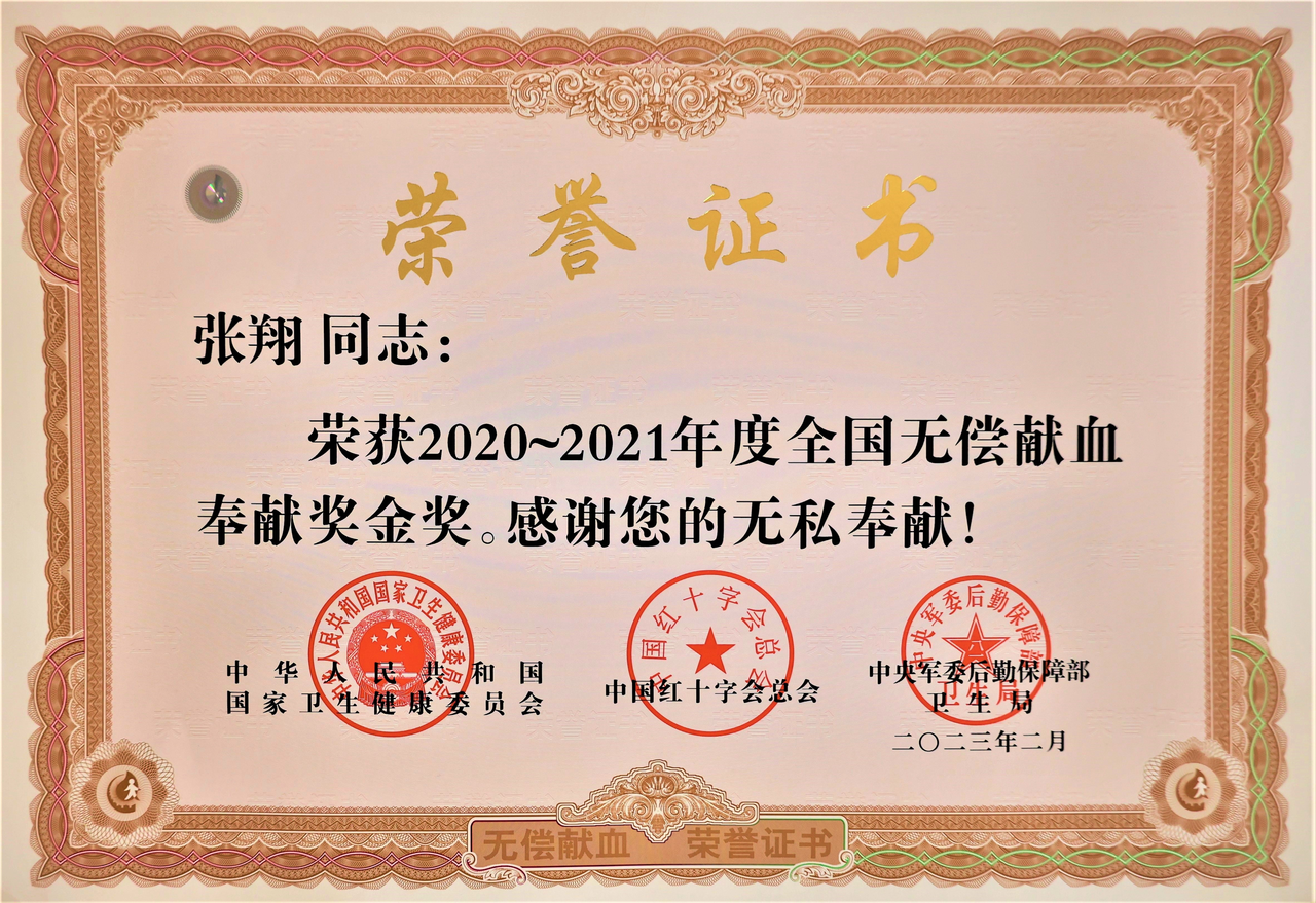 一句朴素的心声,支撑起二十一年不曾间断的奉献。截至目前,张翔已累计献血25次,捐献全血5800毫升、血小板18个治疗量,总献血量达10000毫升,相当于两个成年人全身血液的总和。这组数字背后,是一次次与生命赛跑的紧急接力。他也因此先后荣获全国无偿献血奉献奖铜奖、银奖,直至最高荣誉金奖,成为当地有名的“熊猫血献血冠军”。